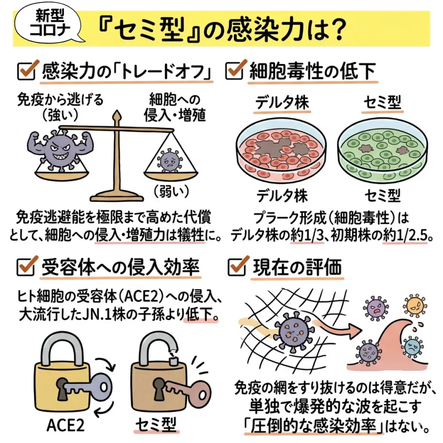 実は、ウイルスの世界には「トレードオフ(何かを得ると何かが失われる)」という進化の法則があります。セミ型は、人間の免疫から逃れる能力を極限まで高めた代償として、細胞への侵入効率や増殖力をある程度犠牲にしていることが研究で明らかになっています。