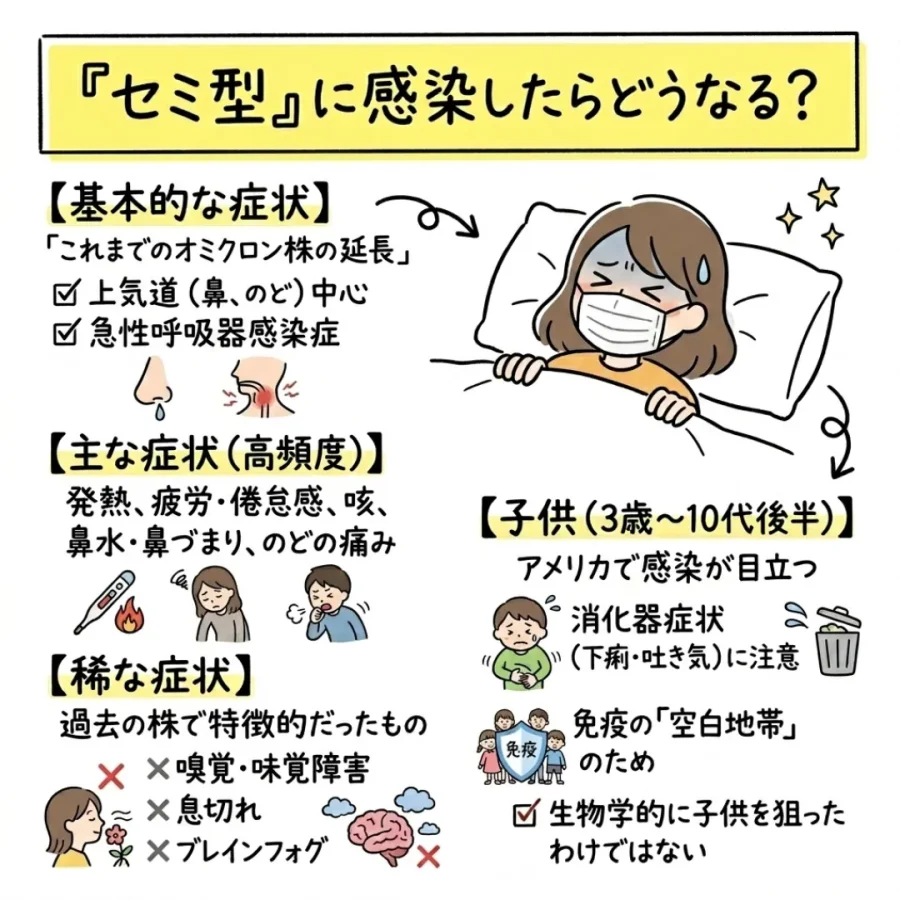 基本的な症状はこれまでのオミクロン株の延長線上にあり、主に鼻やのどなどの上気道を中心とした急性呼吸器感染症を引き起こします。今のところ、セミ型特有の未知の症状(過去に見られなかったような特異な臓器不全など)が報告されているわけではありません。