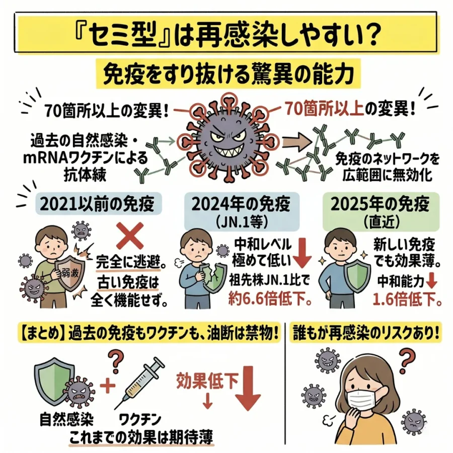 現在各国で展開されているシーズン向けのmRNAワクチン(主にJN.1対応)についても、抗原性が大きく異なるセミ型に対しては試験管内で中和能力が顕著に低下することが分かっています。
