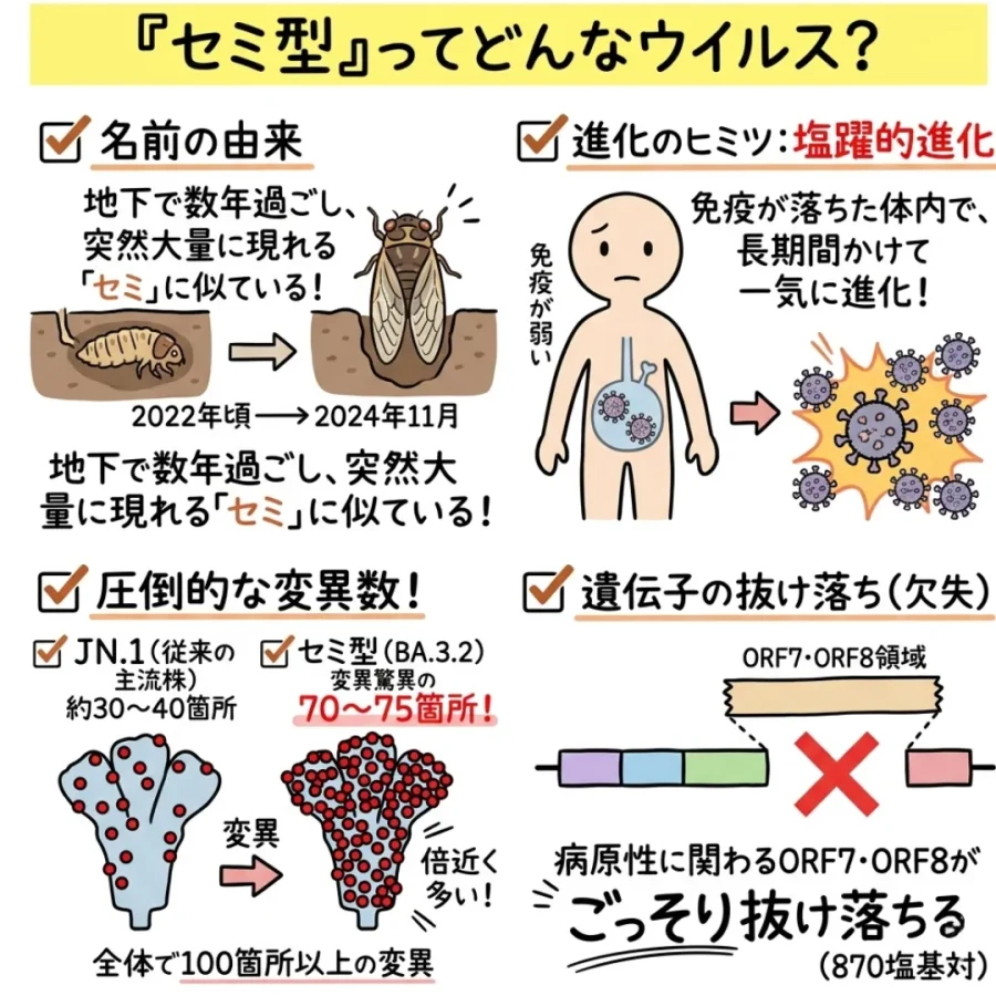 実は、この「セミ型」はこれまでの変異株とは少し違った、非常に興味深い特徴を持っています。今回は、最新の研究論文や各国の公衆衛生機関のデータをもとに、このセミ型ウイルスについて分かりやすく解説していきます。