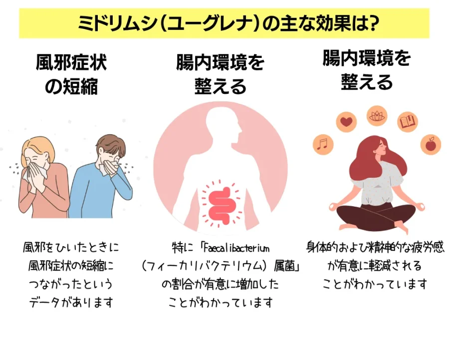 では、ミドリムシを摂取することで、具体的にどのような効果が期待できるのでしょうか。ここでは、ヒトを対象とした臨床試験で、科学的根拠が比較的しっかりと示されている3つの効果をご紹介します。