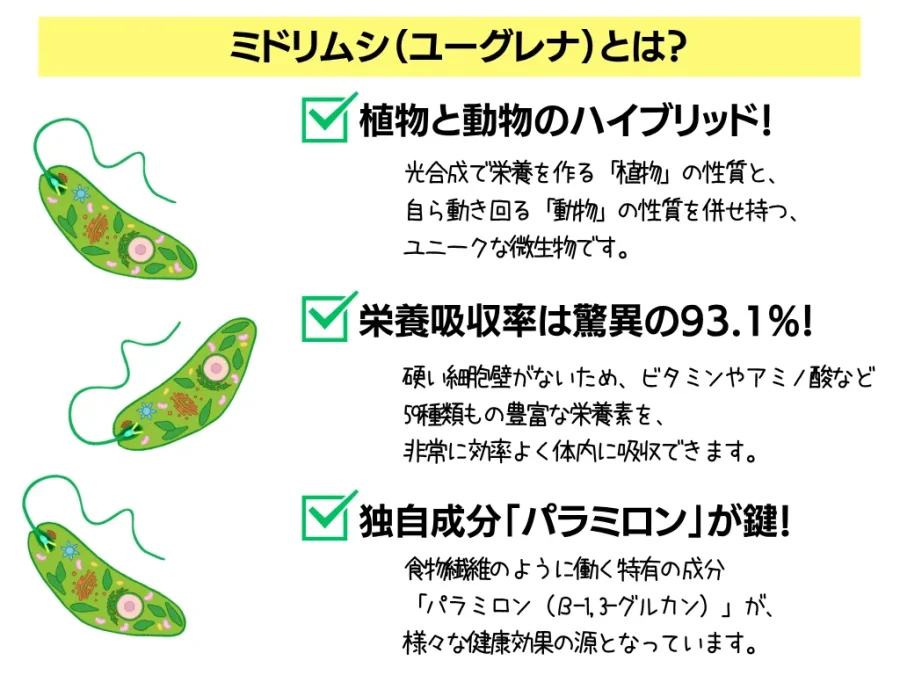 さらに、ミドリムシの健康効果を語る上で欠かせないのが、特有成分である「パラミロン」です。