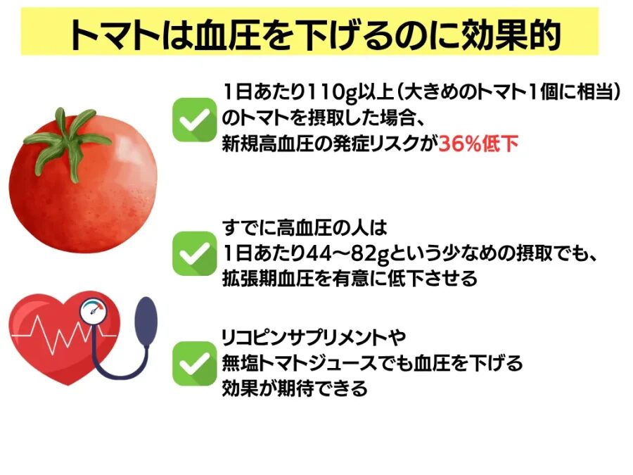 このように、もちろん個人差はありますが、血圧低下のためにトマトを摂取するのは理にかなっていますね。