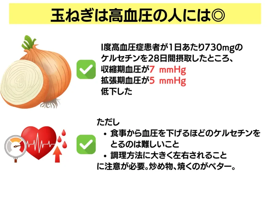 - 玉ねぎ(ケルセチン):高用量のケルセチン摂取により、上の血圧が約7mmHg低下したという研究があります。