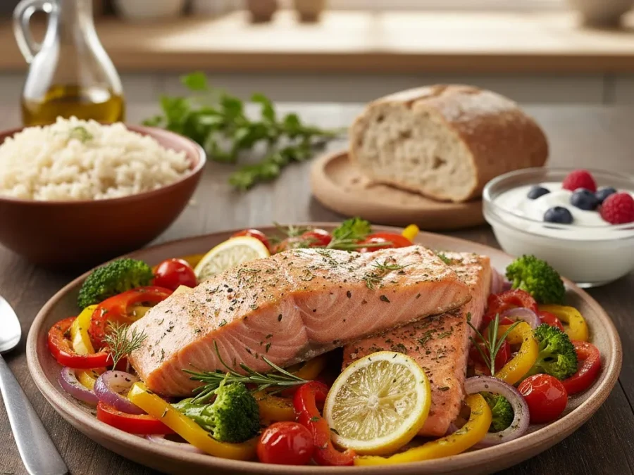 - 味付け ボウルに1の野菜と2の鮭を入れ、オリーブオイル、レモン汁、乾燥ハーブ、黒こしょうを加えて全体に優しく絡めます。