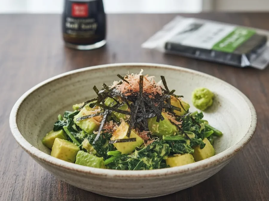 高カリウムのレシピ:アボカドとほうれん草のわさび醤油和え