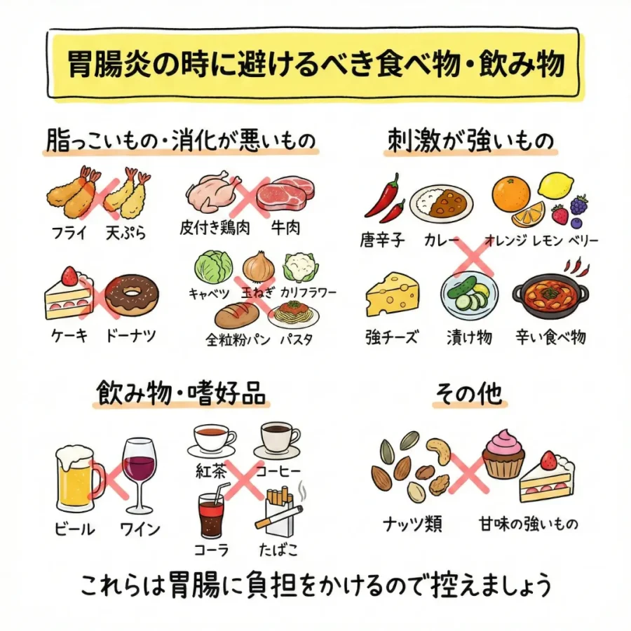 では、胃腸炎や胃腸の調子が悪いときに推奨されないものはなんでしょうか。例えば、胃腸炎の食べ物に関する論文では、次のようなものは避けるべきとされています。
