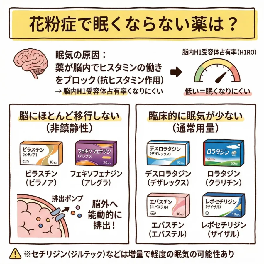 特に以下の薬剤は、脳内への移行が極めて少なく、非鎮静性(眠気を起こしにくい)に分類されています。