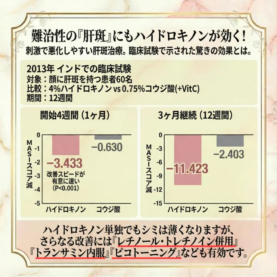 - ハイドロキノン単体:同じ期間で75%以上改善したのは49%に留まりました。