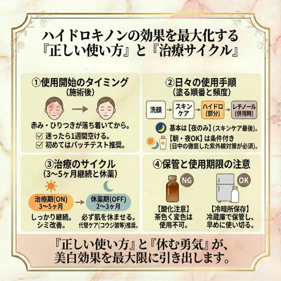 ハイドロキノンは非常に強力な美白剤ですが、その効果を最大限に引き出し、トラブルを避けるためには「正しい使い方」と「休む勇気」が必要です。以下の手順を守ってご使用ください。