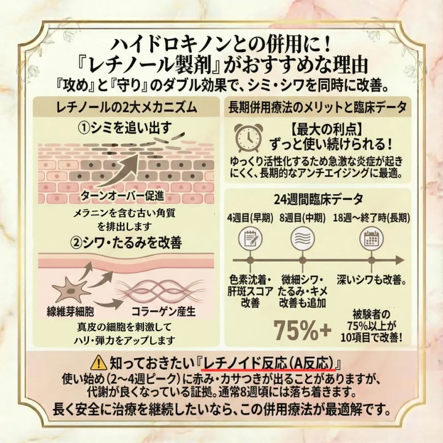 実際、ハイドロキノンとレチノールの併用療法は臨床試験でも確認されています。
