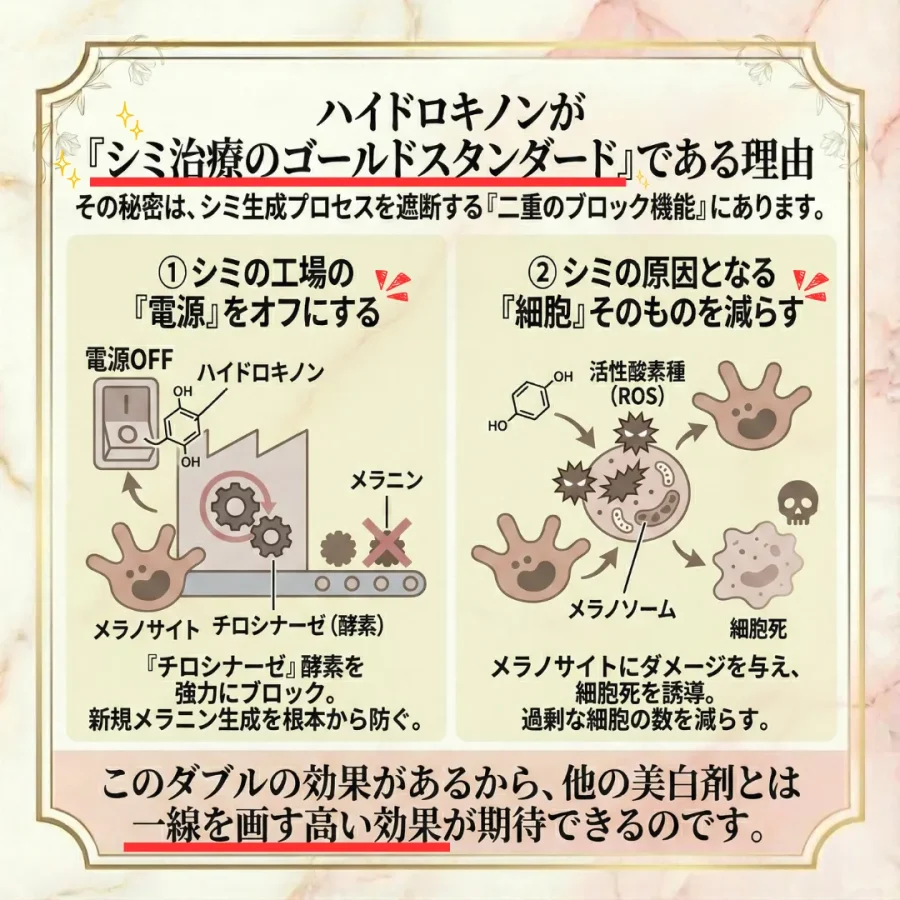 さらに驚くべきは、ハイドロキノンには「メラニンを作る細胞(メラノサイト)にダメージを与える作用」があることですね。
