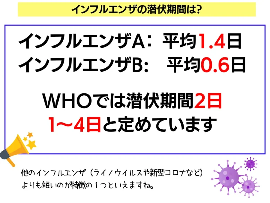 WHOの発表では、インフルエンザの潜伏期間を約2日、範囲として「1日~4日」として定めています。