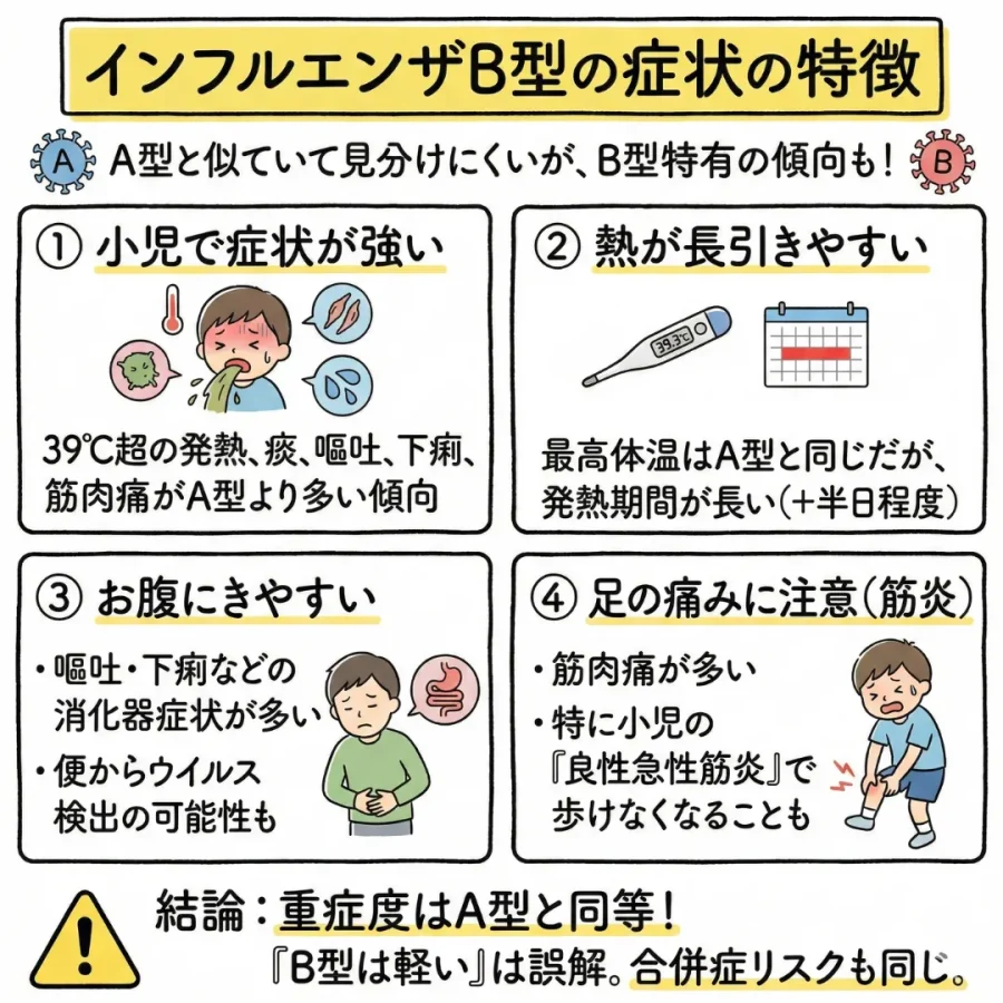 特に「熱が長い」「お腹に来る」「足(ふくらはぎ)を痛がる」といったインフルエンザB型特有のサインに注意し、診断・治療の遅れがないようにすることが大切です。