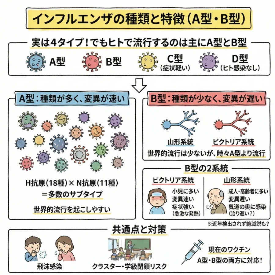 - ビクトリア系統: 小児を中心に流行しやすく、変異のスピードが速いのが特徴です。強い免疫反応を引き起こすため、急激な発熱や全身症状が出やすい傾向があります。