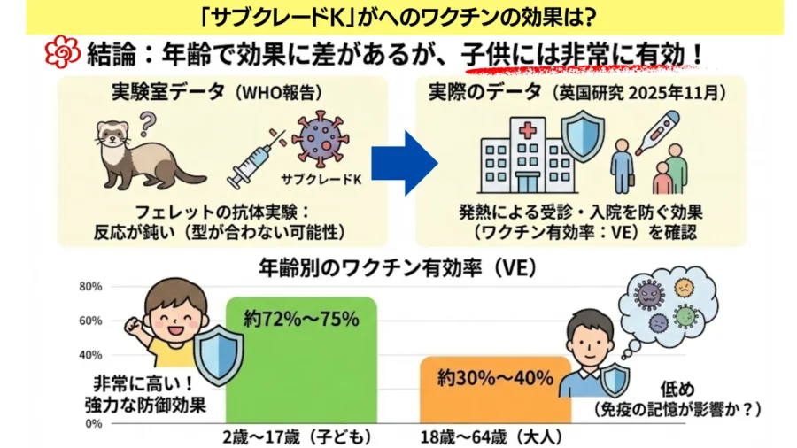 WHOの報告によると、実験室でフェレットの抗体を使った試験を行うと、今年の北半球用ワクチンで作られる抗体は、この「サブクレードK」に対して反応が鈍い(反応性が低下している)ことが確認されています。つまり、型がぴったり合っているとは言いにくい状況です。