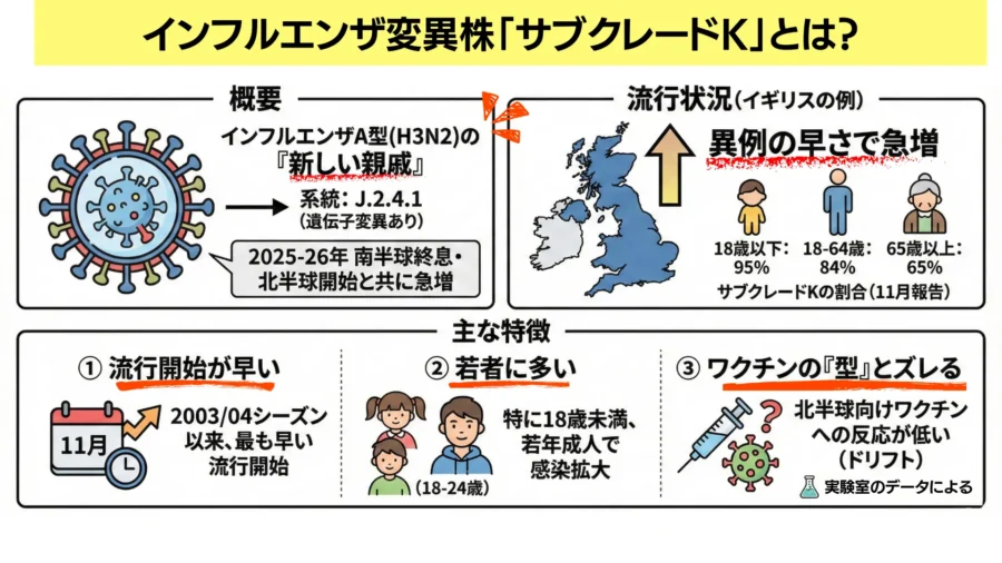 まず、「サブクレードK」とは何でしょうか。簡単に言うと、インフルエンザA型(H3N2)の「新しい親戚」のようなものです。