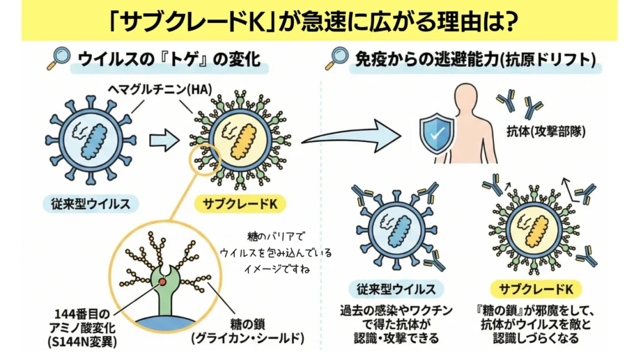 その秘密は、ウイルスの表面にある「トゲ」の変化にあります。 インフルエンザウイルスの表面には「ヘマグルチニン(HA)」というタンパク質があるのですが、サブクレードKはこの部分に多くの変異(アミノ酸の置き換わり)を起こしています。