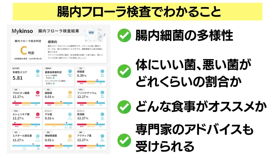 マイキンソーでは、健康や美容に特に関わりが深いとされる、様々な菌の割合を知ることができます。