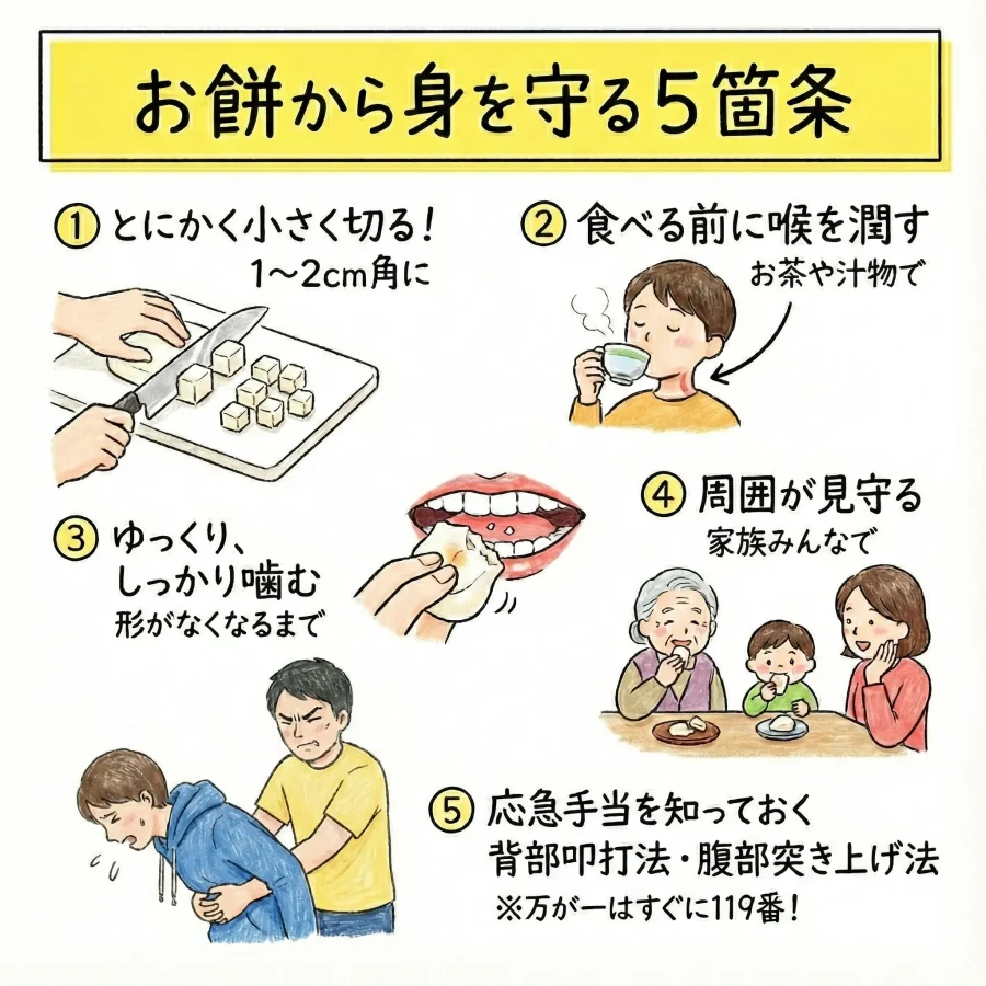 お正月早々、お餅で悲しい事故になったら、せっかくのお正月が台無しですよね。今日から実践できる「お餅から身を守る5箇条」を覚えておきましょう。