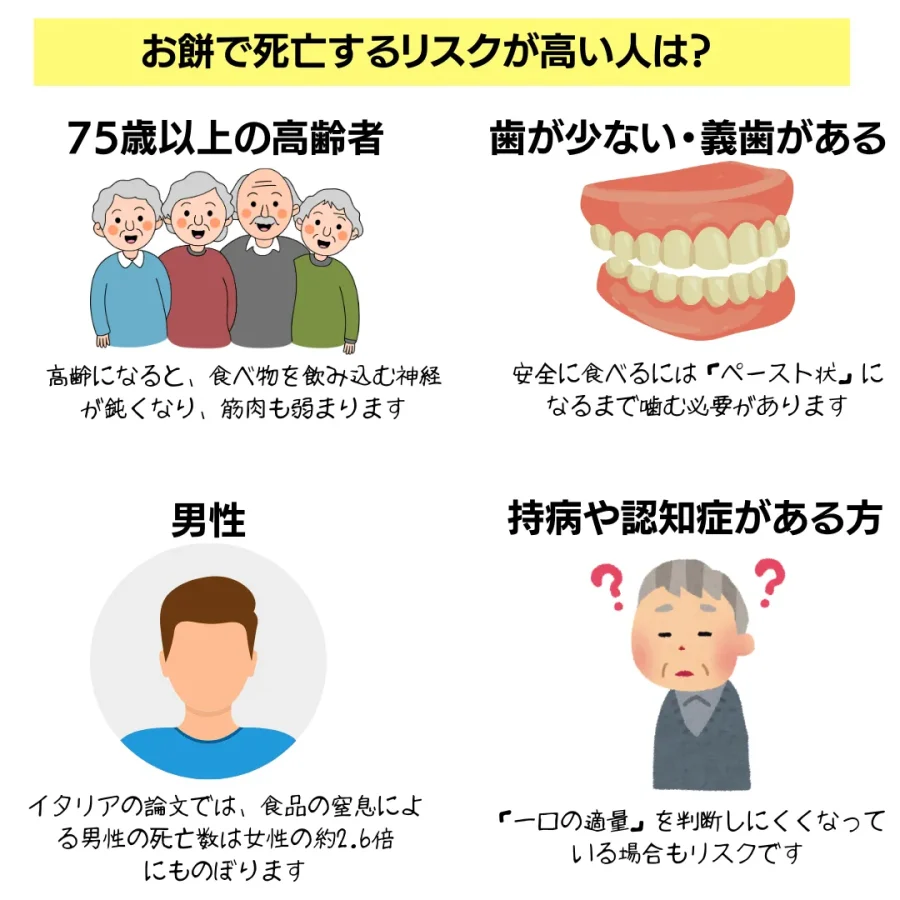 • 歯が少ない・義歯を使っている方 :お餅を安全に食べるには、唾液と混ぜて「ペースト状」になるまで噛む必要があります。しかし、自分の歯が少なかったり義歯が合っていなかったりすると、十分に噛み砕けないまま大きな塊で飲み込んでしまいがちです。