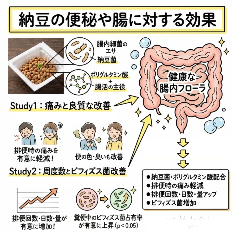 (参照:Improvement of Bowel Movement in Healthy Adults Through Intake of Natto Powder For 4 Weeks – A Randomized, Placebo-Controlled, Double-Blind, Clinical Study)