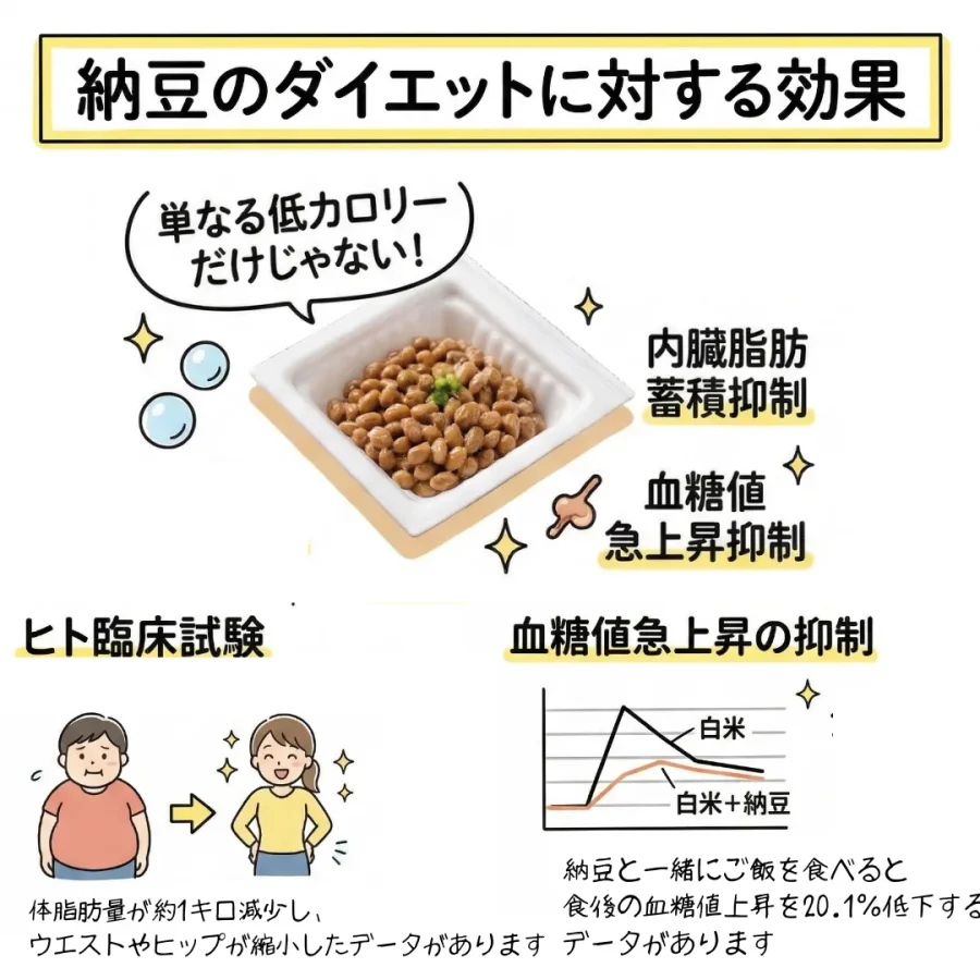 納豆は実はダイエットにも効果的。単なる低カロリー食品という意味だけでなく、コレステロールの代謝を活性化したり、内臓脂肪の蓄積をおさえたり、食後血糖値の上昇を抑えたりする効果が言われているんです。