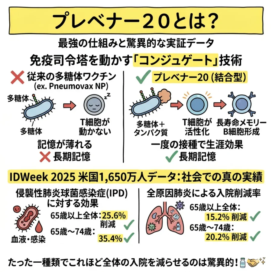 一方で、プレベナー20は、多糖体にタンパク質を結合(コンジュゲート)させています。これにより、免疫系は「これは大変な敵だ!」と強力に認識し、T細胞が活性化されます。その結果、メモリーB細胞という「長期間、敵を覚え続ける細胞」が体内に作られるのです。これが、一度の接種で生涯にわたる効果が期待できると言われている理由です。