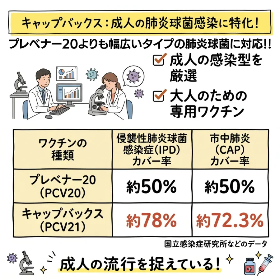 キャップバックスの最大のメリットは、「血清型カバー率」が他のどのワクチンよりも優れている点です 。 日本の高齢者(65歳以上)を対象とした近年の調査では、以下の結果が報告されています。