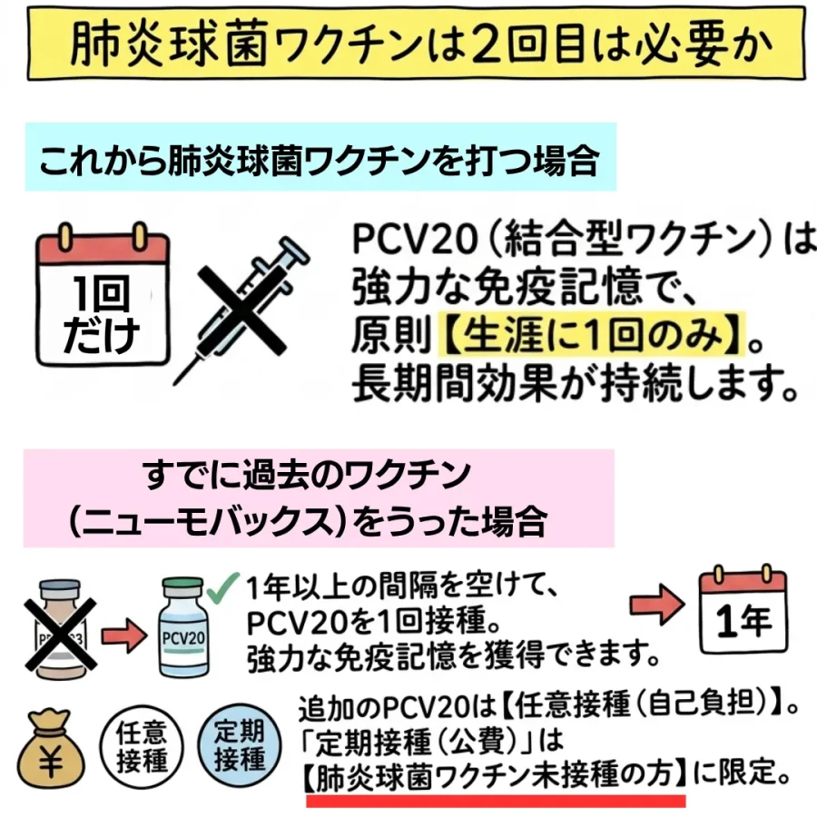 - ニューモバックス(旧来のワクチン)のみを接種済みの方: 直近の接種から「1年以上」の間隔を空けて、プレベナー20を1回接種することが勧められます。これにより、多糖体ワクチンでは得られなかった強力な免疫記憶を獲得できます。