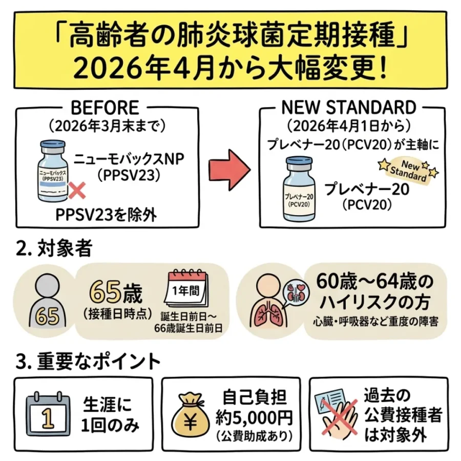 2026年4月1日より、日本の高齢者肺炎球菌定期接種は「プレベナー20(PCV20)」を唯一の対象ワクチンとする新しいフェーズに突入しました。