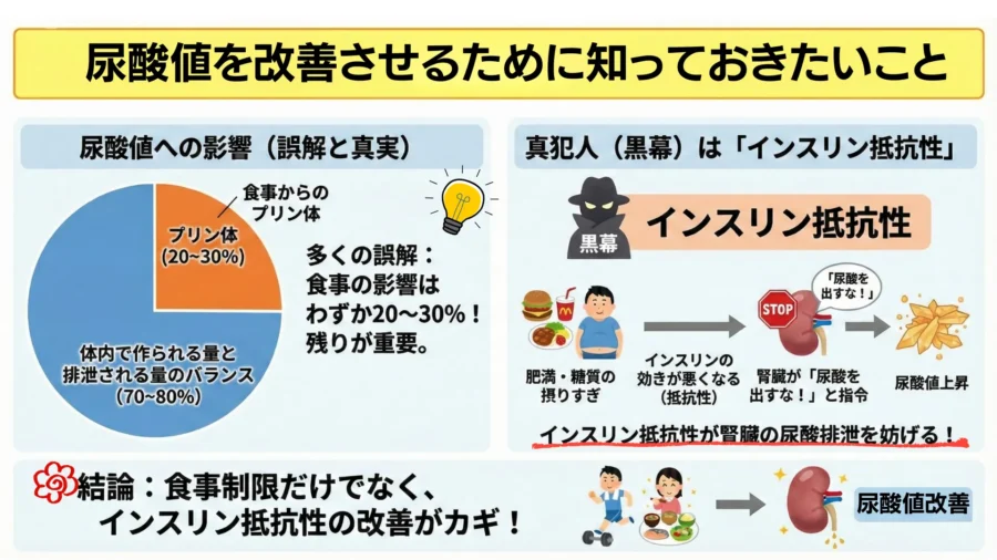近年の研究で、尿酸値を高くしてしまう真犯人(黒幕)の一つが「インスリン抵抗性」であることがわかってきました。簡単に言うと、肥満や糖質の摂りすぎでインスリンというホルモンの効きが悪くなると、腎臓が「尿酸を体の外に出すな!」という指令を出してしまうんですね。