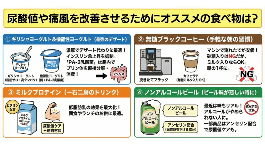 一番のオススメな商品はヨーグルト系ですね。特に、ギリシャヨーグルトは脂肪ゼロで高タンパク。非常に濃厚なので、デザート代わりになります。 甘いケーキやプリンを食べるなら、絶対にこちらを選んでください。インスリンの急上昇を抑え、尿酸ケアに繋がります。