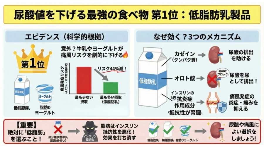 脂肪分(飽和脂肪酸)の多い乳製品は、先ほどお話しした「インスリン抵抗性」を悪化させ、せっかくの尿酸排出効果を打ち消してしまう可能性があります。 必ず「低脂肪乳」「無脂肪乳」「脂肪0ヨーグルト」を選んでください。これが鉄則です。
