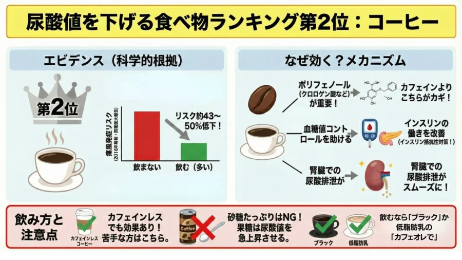 ちなみに、コーヒーは痛風のリスクを下げますが、尿酸値そのものを下げる効果ははっきりしていません。(しかし、痛風のリスクを下げる効果が非常に強いことと、大規模臨床試験が行われている点で第2位としています)