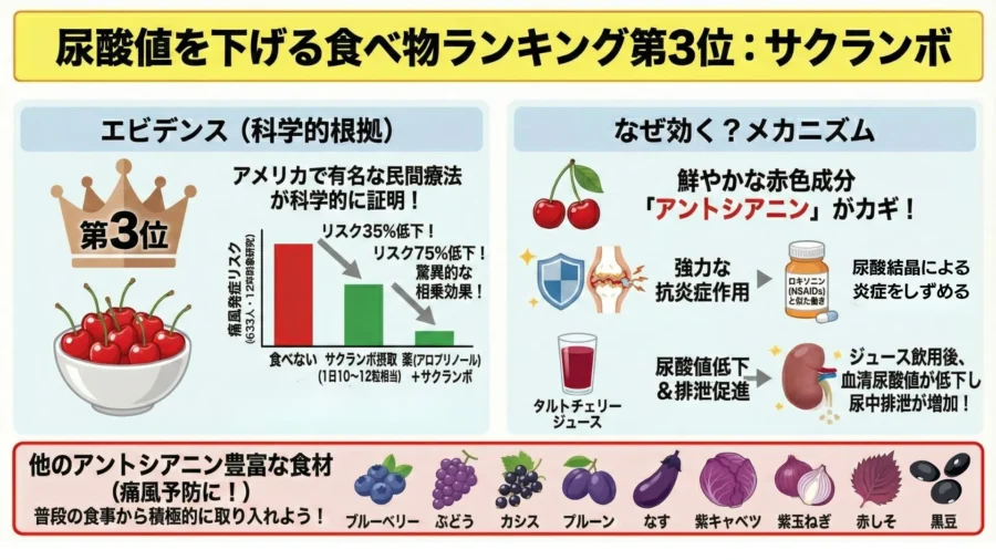 第3位は、フルーツ界からのランクイン、「サクランボ」です。 特にアメリカでは「痛風にはチェリー」と言われるほど有名な民間療法でしたが、これが科学的にも正しいことが証明されました。