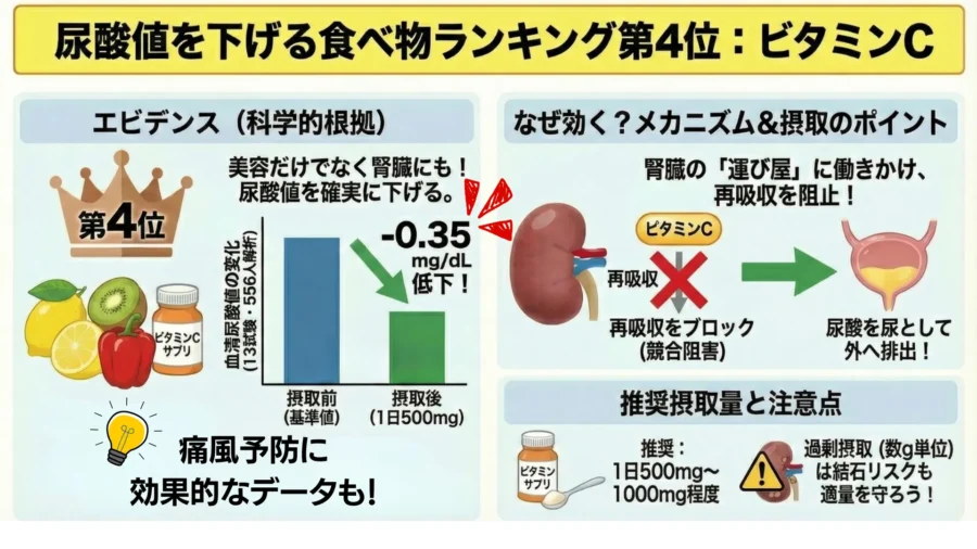 (参照:Effect of oral vitamin C supplementation on serum uric acid: a meta-analysis of randomized controlled trials