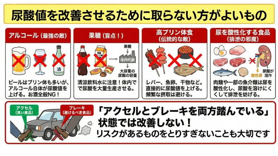 これらの食事をとっている場合は、「アクセルとブレーキを両方踏んでいる状況」になるので、上記の「尿酸値を下げる食品」をとっていても尿酸値が下がるかどうかはわかりません