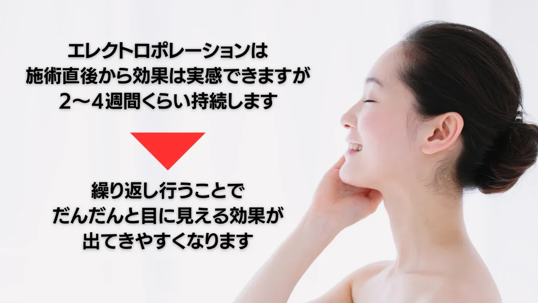 しかし、エレクトロポレーションは1回の施術でもくすみ解消、うるおいアップ、毛穴開きの改善、肌のハリやキメのアップといった効果が実感しやすいものの、しみやしわ、肌の赤みなどを改善するまでには、ある程度の回数が必要なことに注意しましょう。