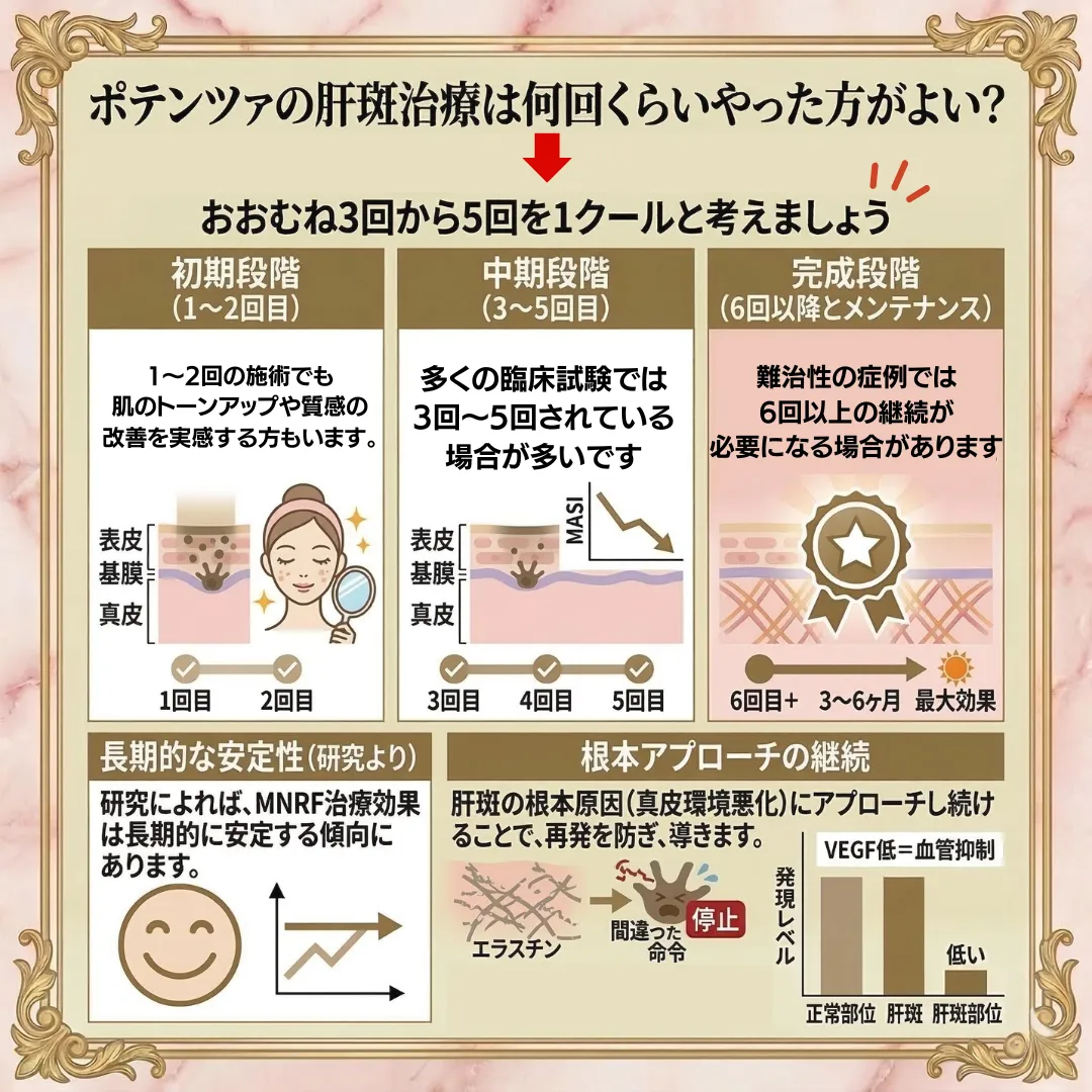 - 完成段階(6回以降およびメンテナンス): 重症または難治性の肝斑の場合、6回以上の継続が必要となることがあります。最終的な効果は、最終施術から3ヶ月から6ヶ月かけて、コラーゲンの成熟とともに最大化されるでしょう。