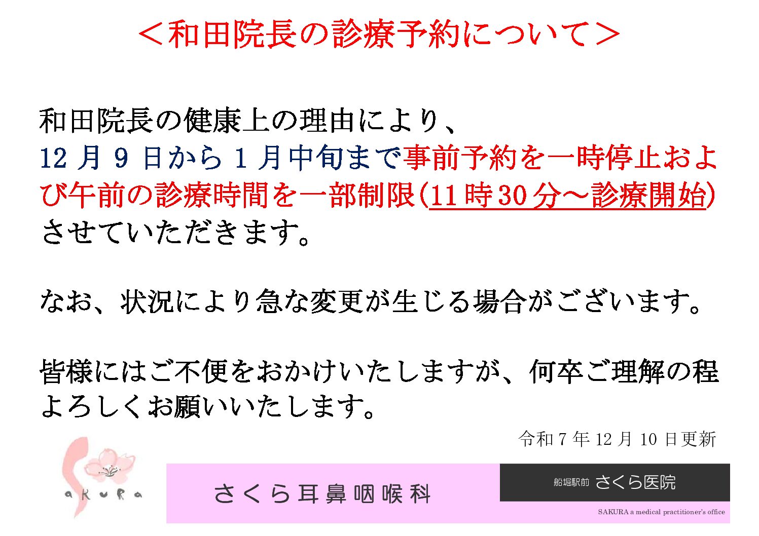 | 当日予約 | 9:00~18:20 (土9:00~16:50) (日9:00~12:50) |